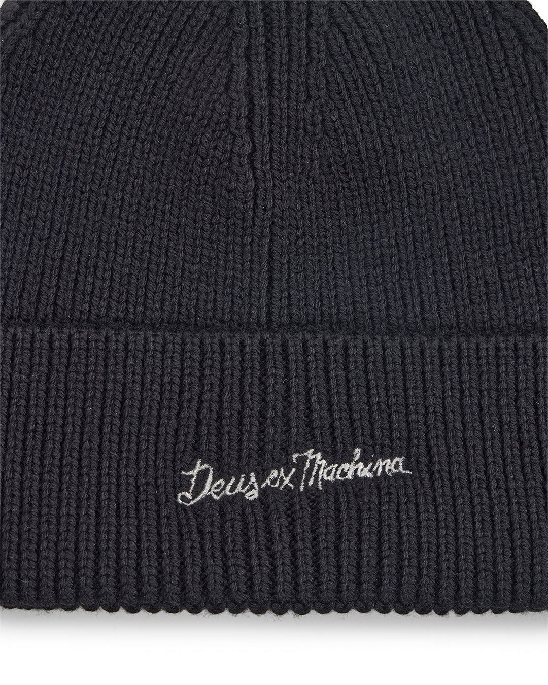 メリノウール製ニット・ビーニー。デウス・エクス・マキナの刺繍とレザーエンボスタグ 。