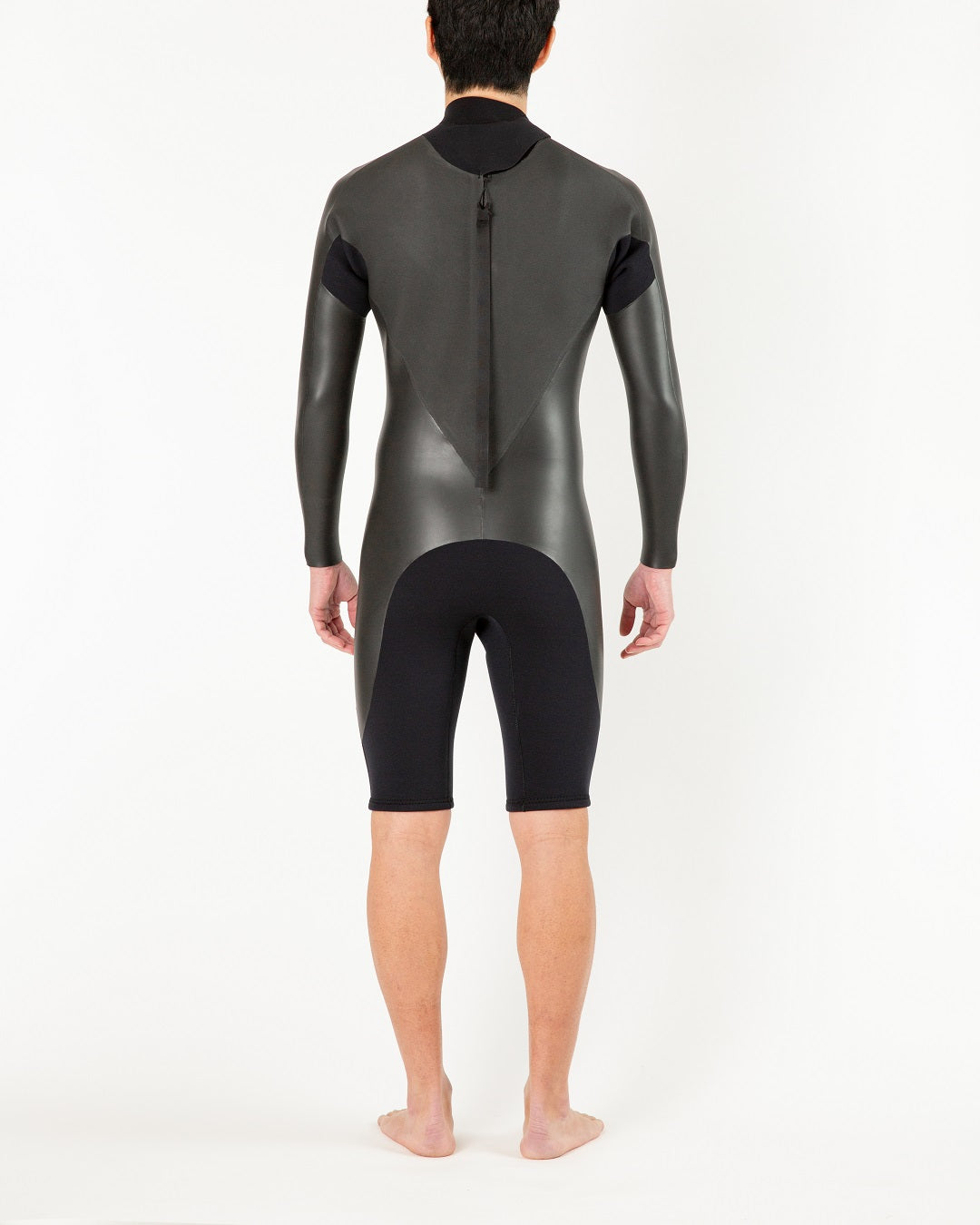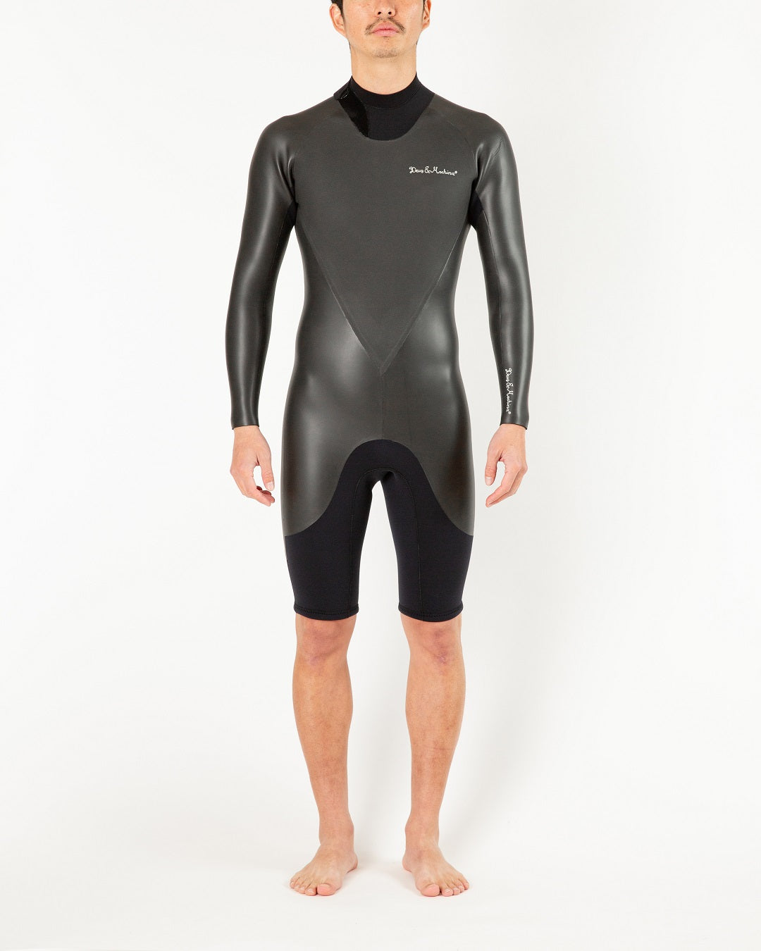 バックジップタイプのLONG SLEEVE SPRING。左胸と左袖にスクリプトロゴ使用。2mmMTZラバーMADE IN JAPANマテリアル : 適度な伸縮性を持ちソフトな肌触りが特徴のコストパフォーマンスに優れたマテリアルです。