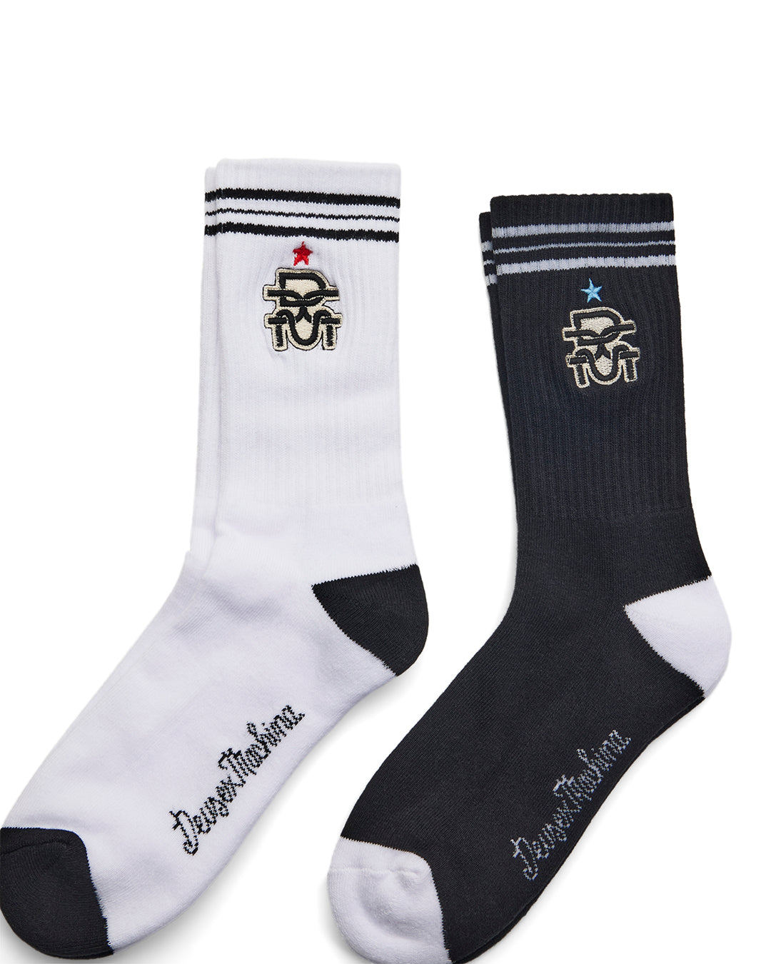 デウス・エクス・マキナのカスタム刺繍入りクルー・ソックス・ツイン・パック。ソールにはジャカードロゴ。 コットン・ポリ混紡。
