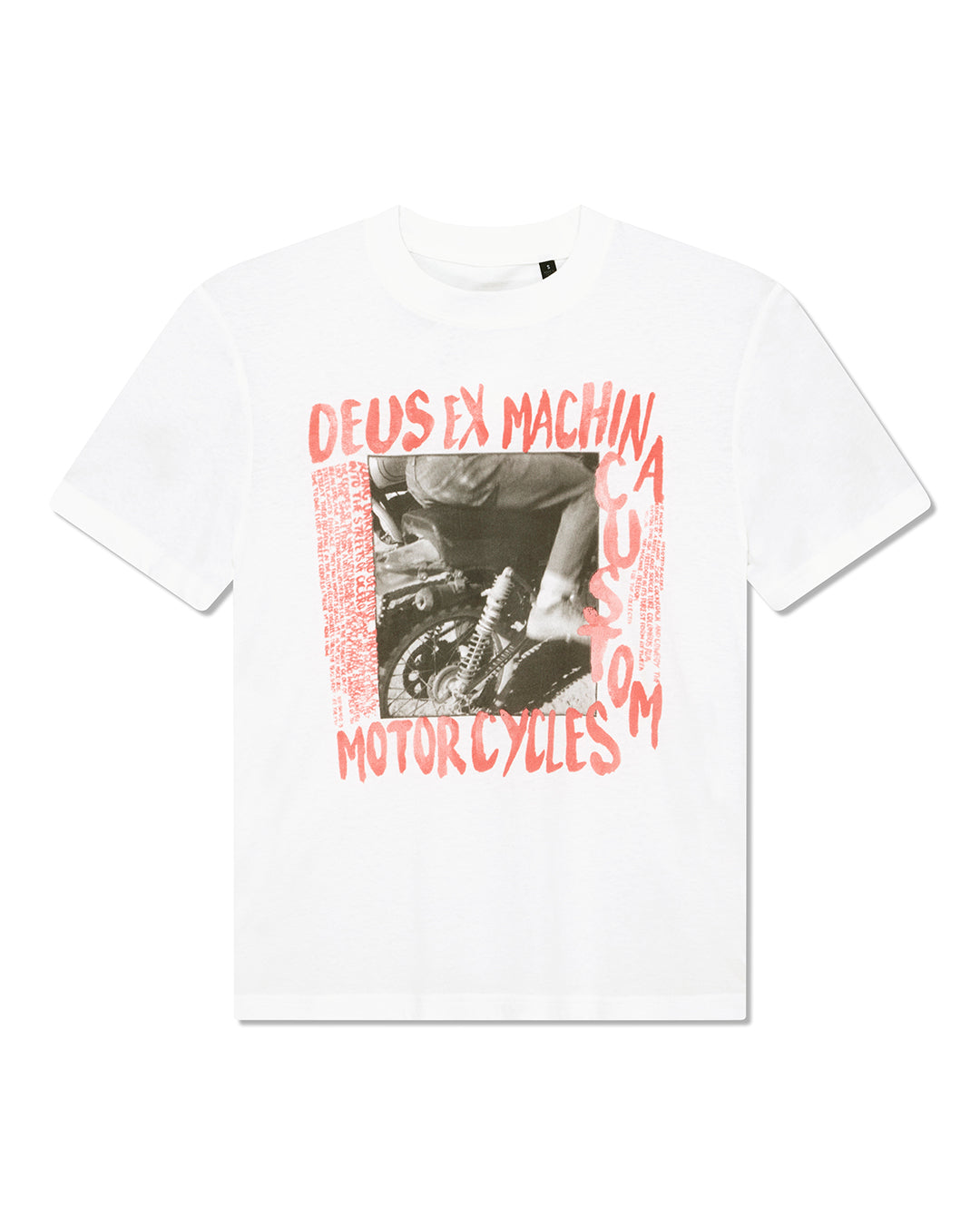 デウス・エクス・マキナ・アーカイブ写真を使用したカスタムプリントのグラフィックTシャツ。 ガーメントウォッシュ仕上げ。 リサイクル・コットンブレンド。