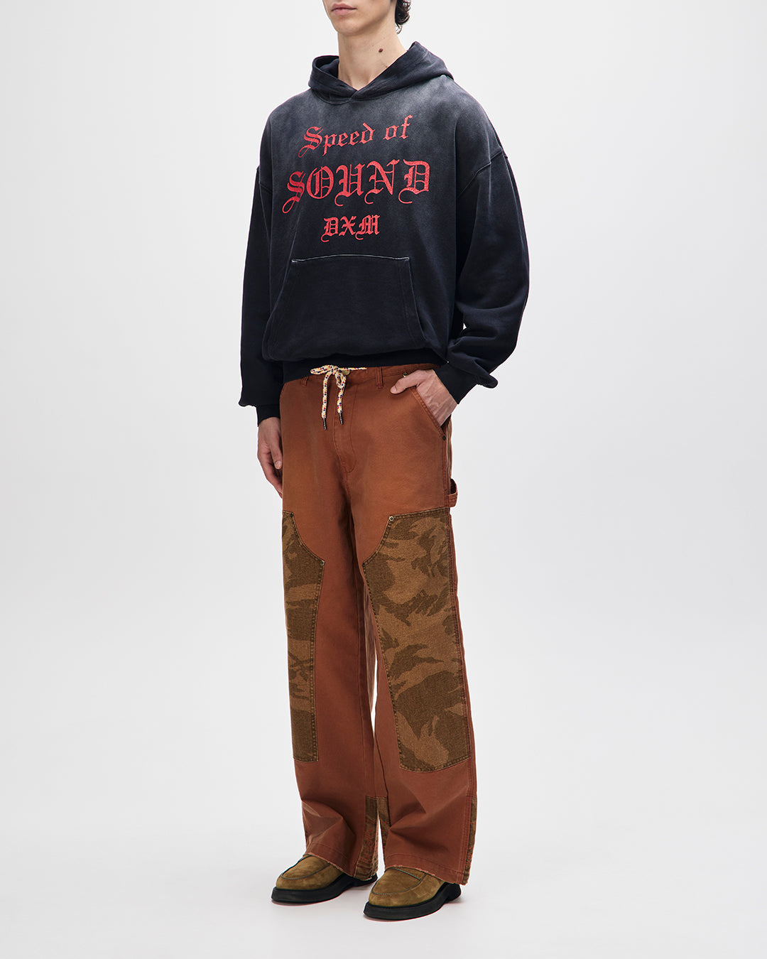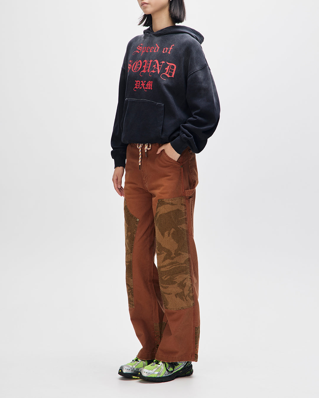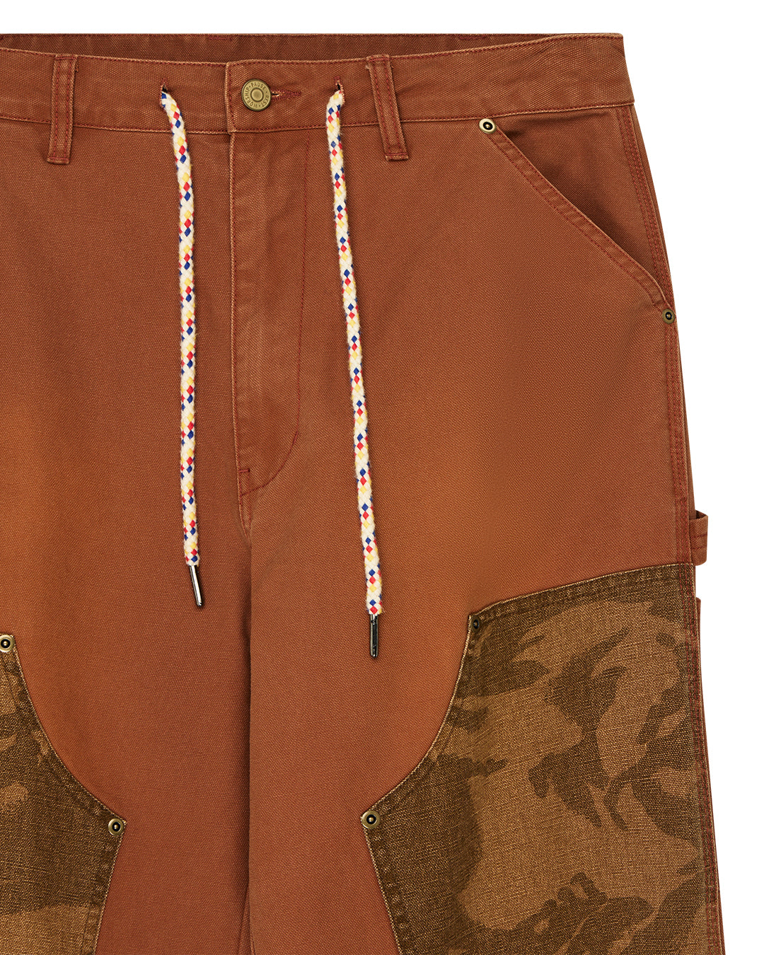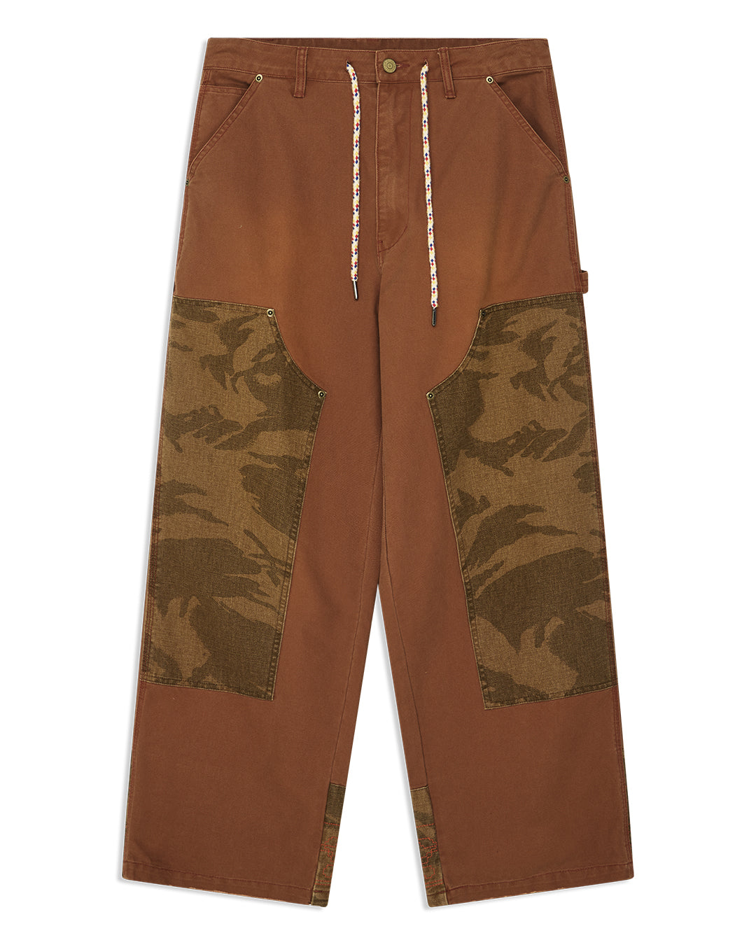 デウス・レコーズの変わらぬ理念のもと、この新しいドロップは巻き戻しと早送りを繰り返しながら、ノスタルジアを表現している。 大げさなシルエットと特注の花柄が、ミリタリスティックでスポーツドリブンなディテールと肩を並べ、個性的な表現を支持する。オーバーサイズ・フィットのダブルニーパンツ。膝パネルにカモフラージュパターンでコントラスト。ウエストにドローコード、ポケット口には真鍮のリベット、ハンマーループが付くペインターパンツモデル。 ガーメントダイのキャンバス生地。ウォッシュ、フェード加工。