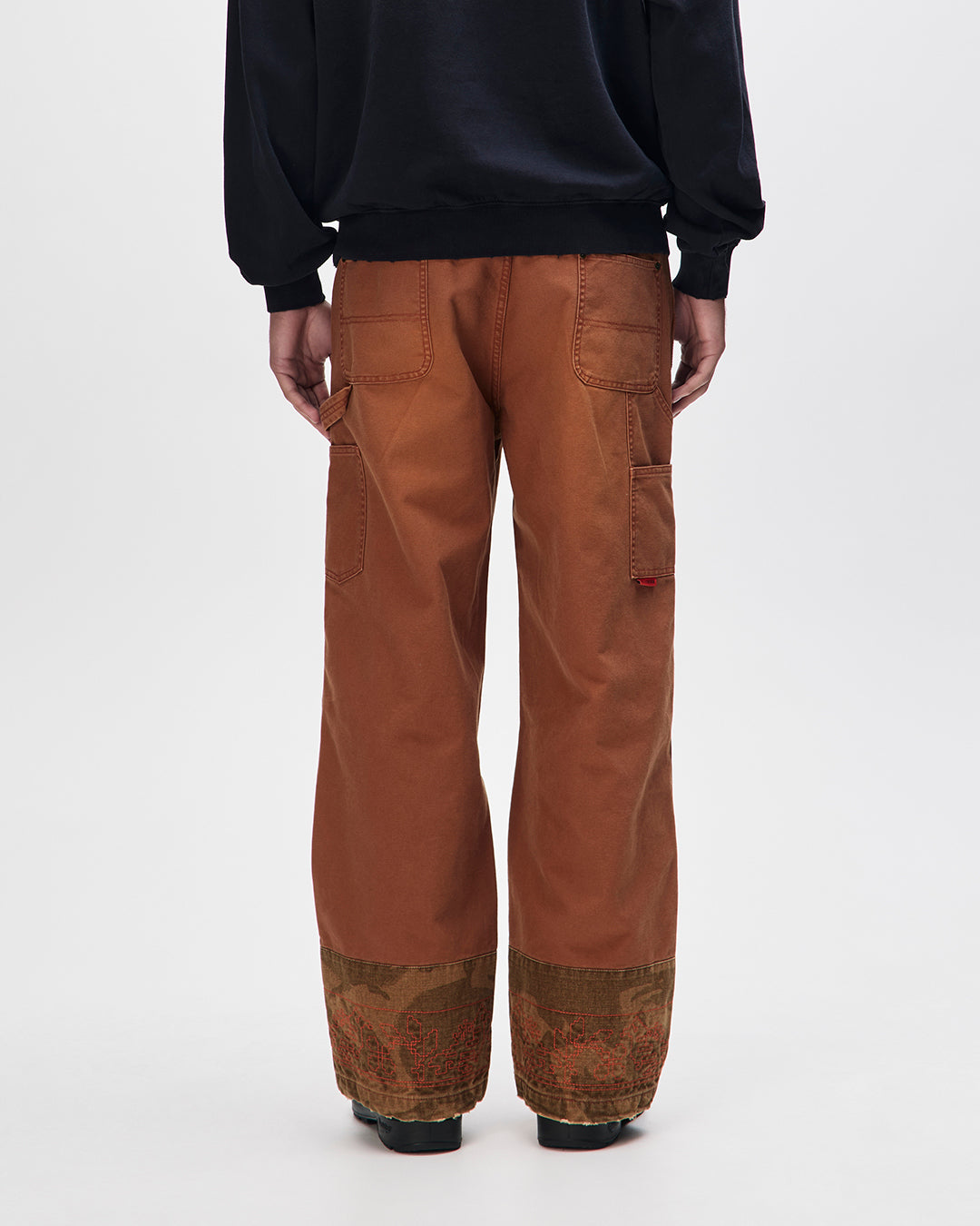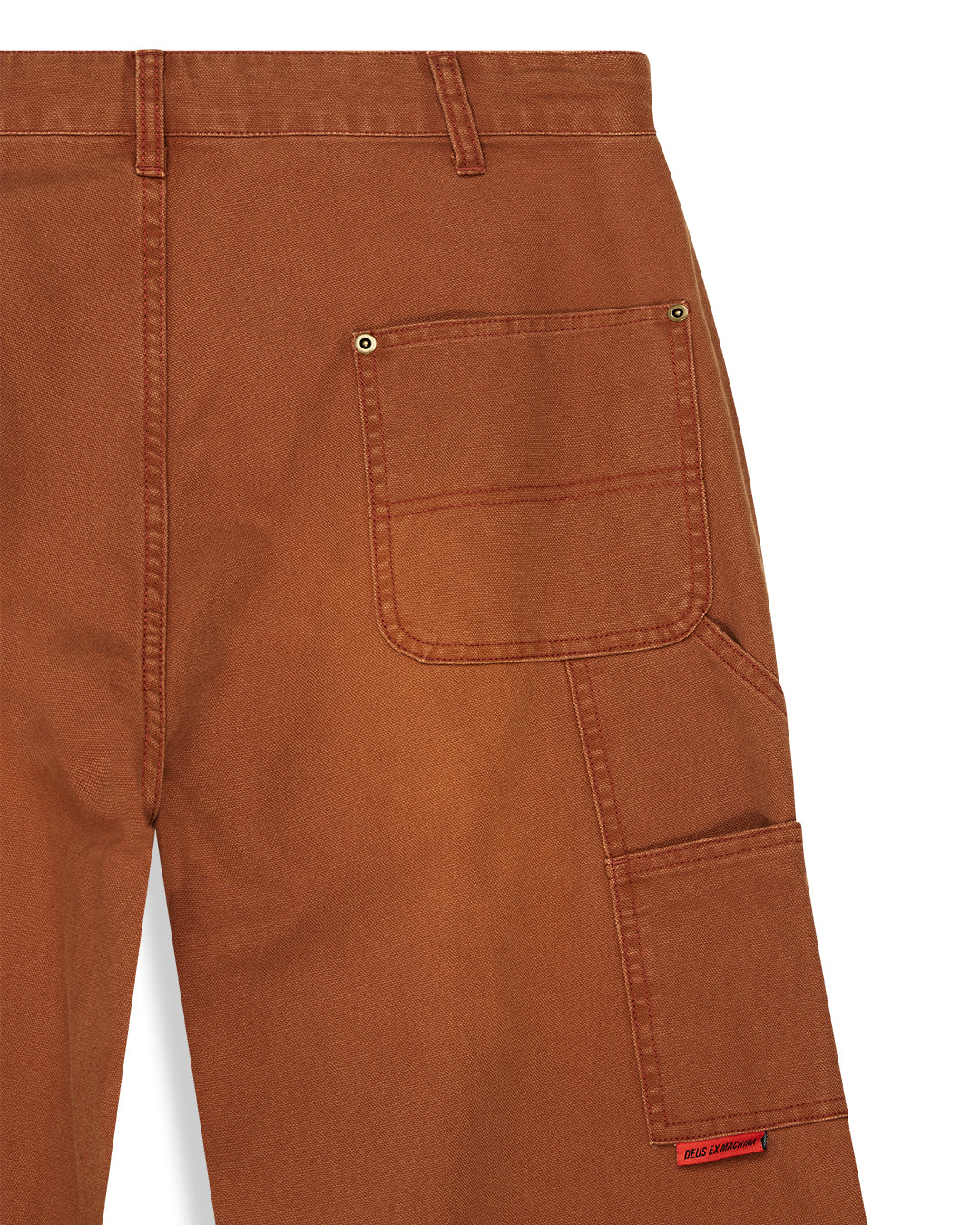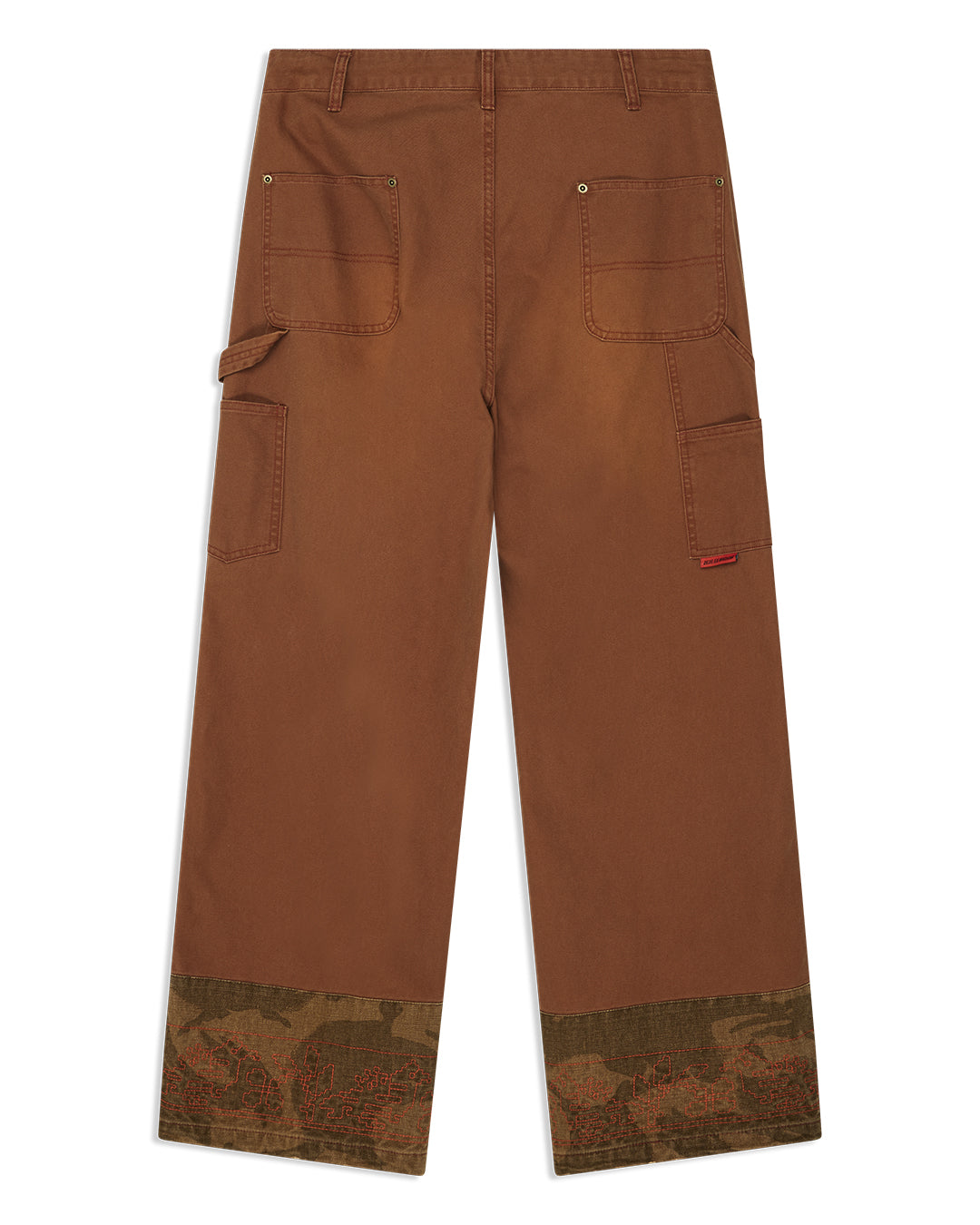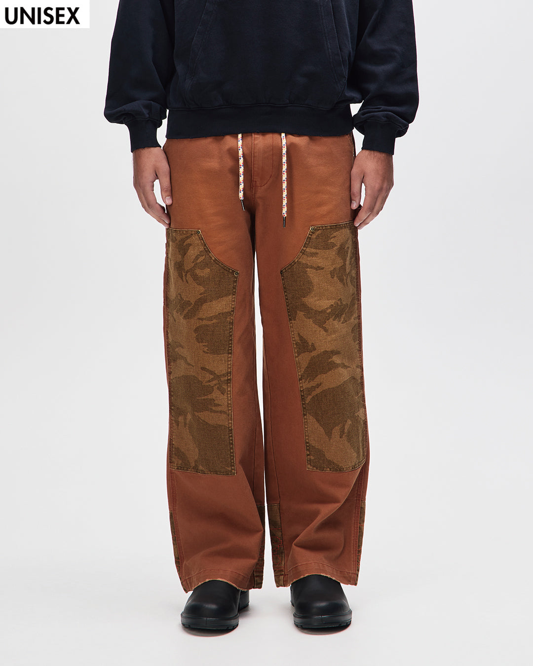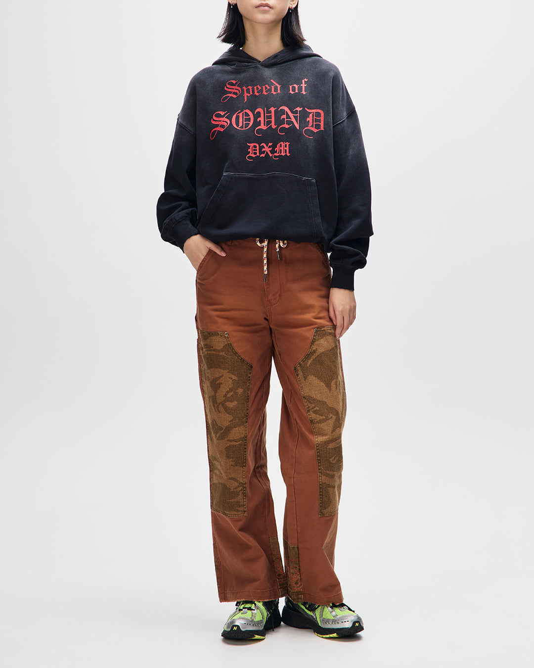 デウス・レコーズの変わらぬ理念のもと、この新しいドロップは巻き戻しと早送りを繰り返しながら、ノスタルジアを表現している。 大げさなシルエットと特注の花柄が、ミリタリスティックでスポーツドリブンなディテールと肩を並べ、個性的な表現を支持する。オーバーサイズ・フィットのダブルニーパンツ。膝パネルにカモフラージュパターンでコントラスト。ウエストにドローコード、ポケット口には真鍮のリベット、ハンマーループが付くペインターパンツモデル。 ガーメントダイのキャンバス生地。ウォッシュ、フェード加工。