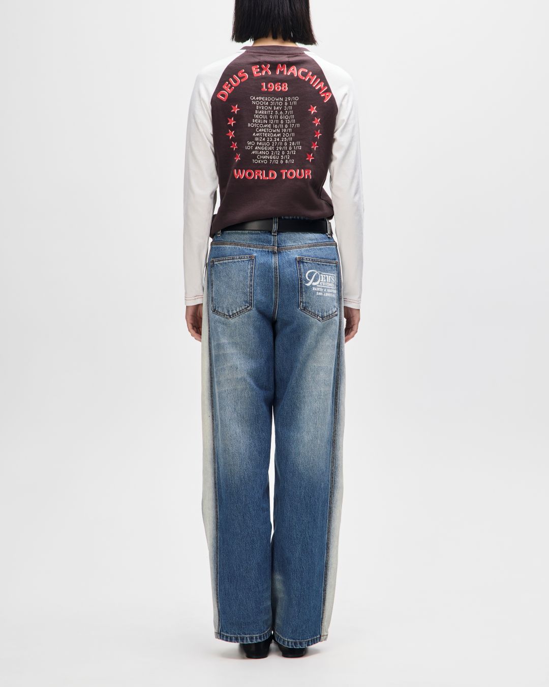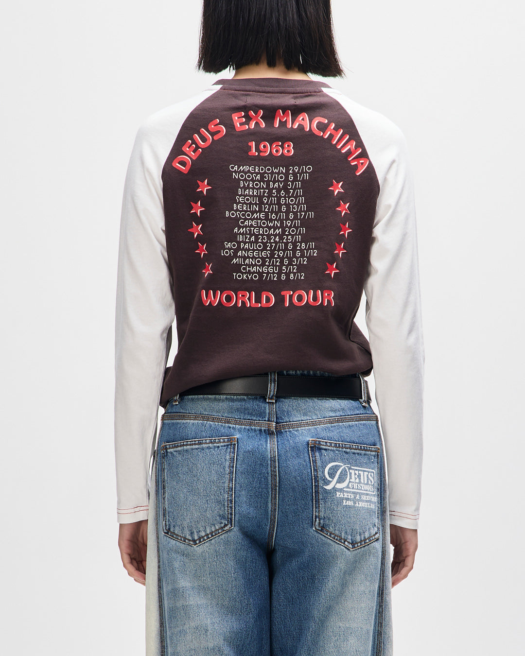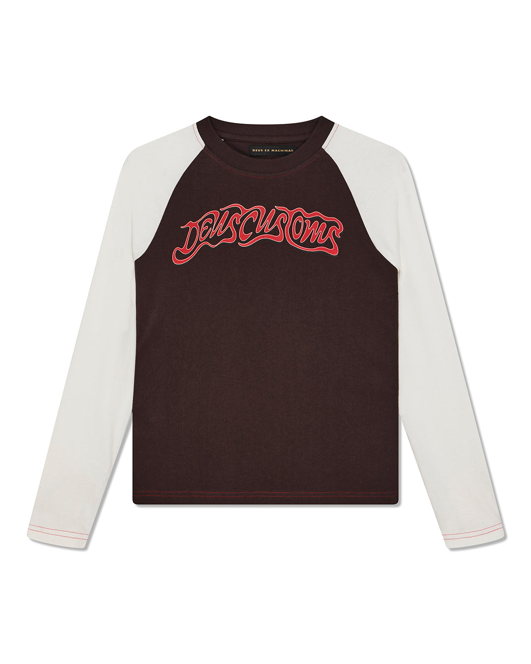 ミッドウェイトラグラン・ロングスリーブTシャツ。 ベースボールTシャツの切り替えコントラストスリーブ。フロントにDEUSオリジナルアートプリント。ソフトウォッシュ仕上げの リサイクル・コットン混紡素材。
