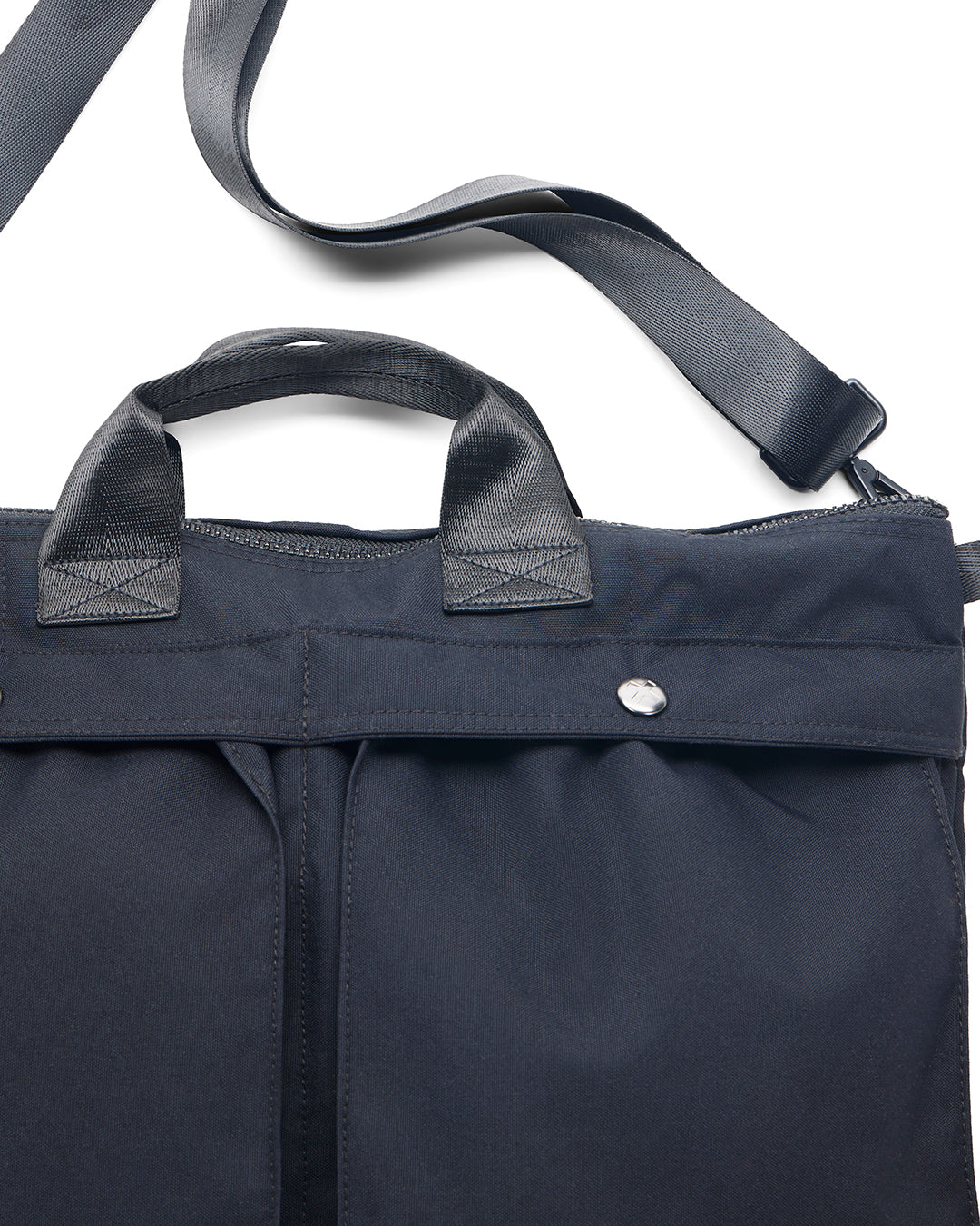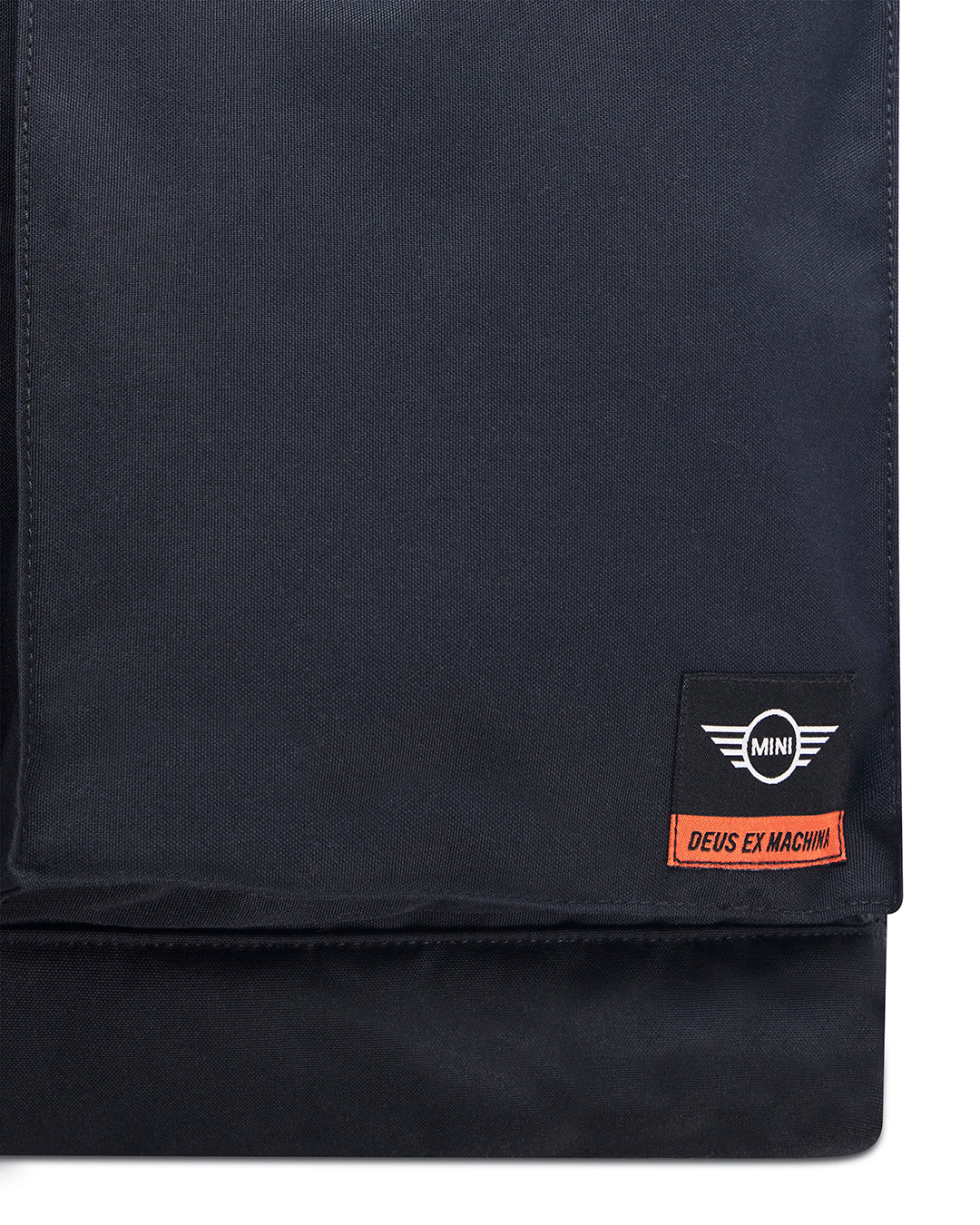 大型のヘルメット型2WAYトートバッグ。DEUS EX MACHINA/MINIコラボレーションアートスナップとポケットラベルのディテールが施され、フロントに大型ポケット2つ、内装にポケットとノートPC用コンパートメント、ショートハンドル、取り外し可能なショルダーストラップ付き。