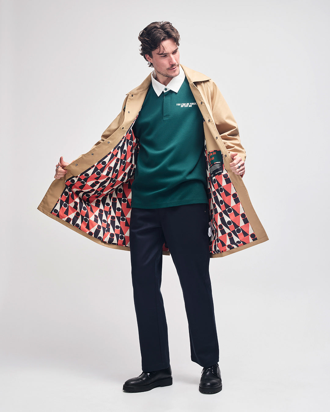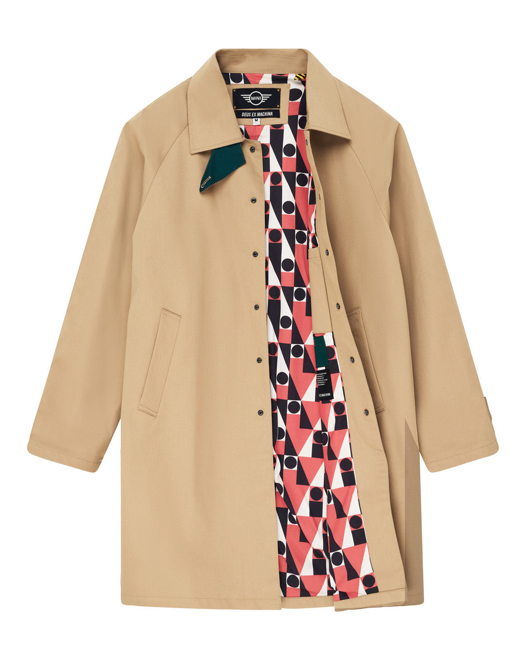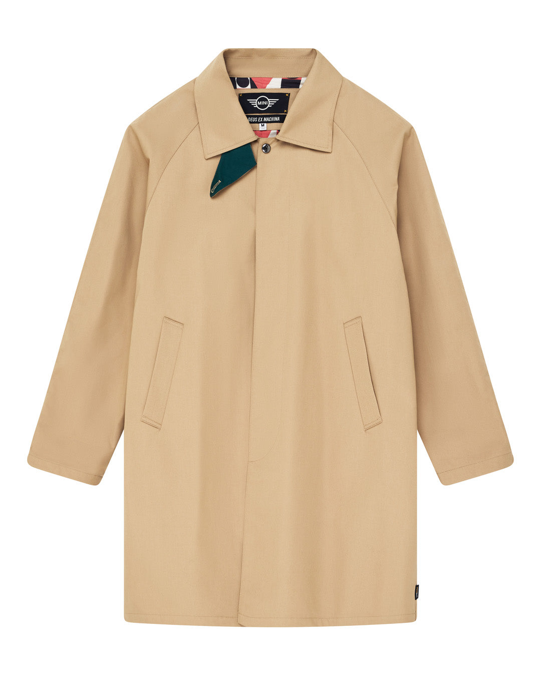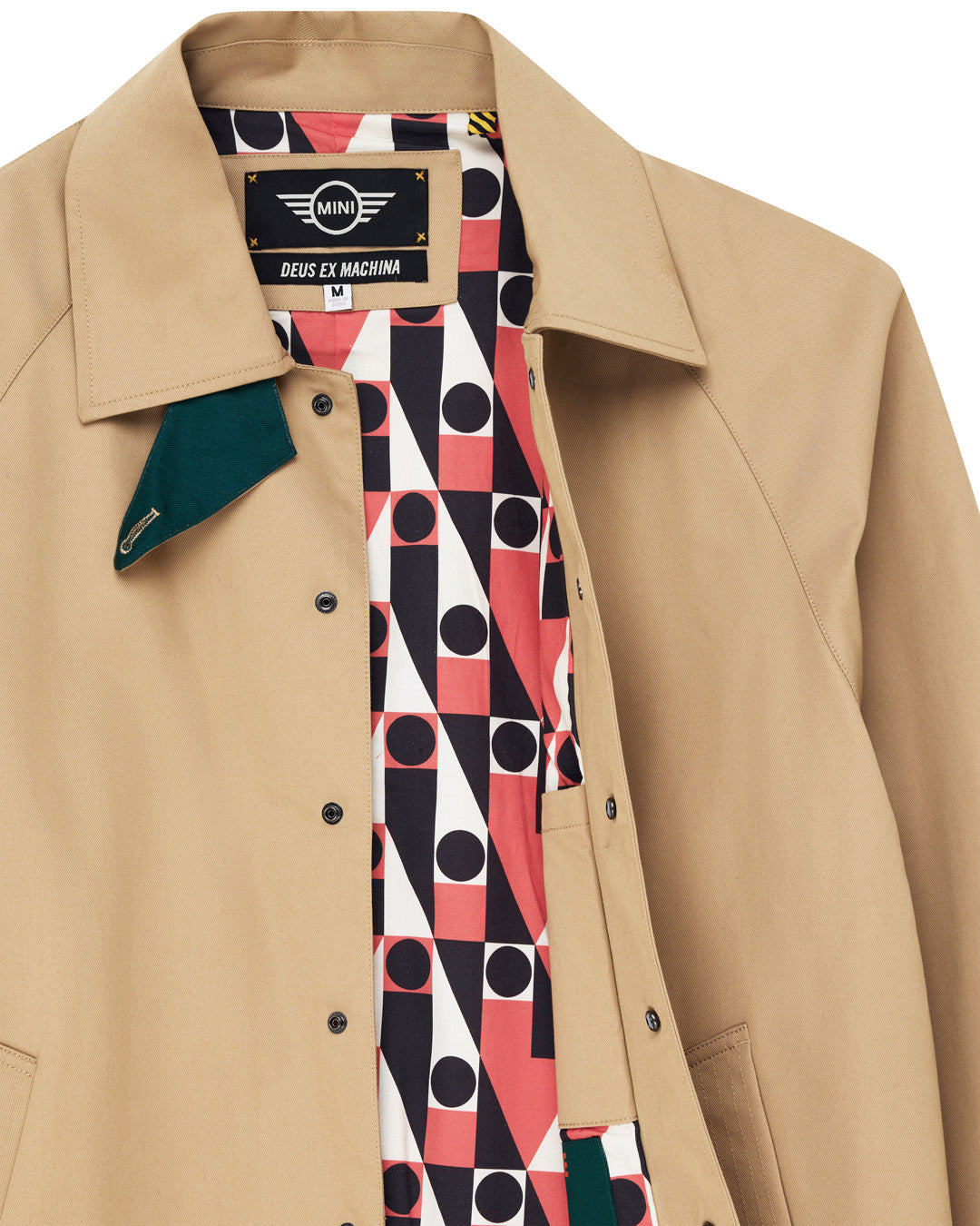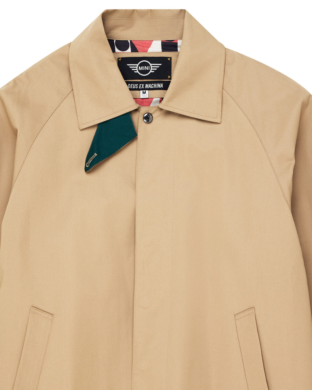 Deus Ex MachinaとMINIは、MINIとDeusのクルマに対する情熱の歴史的な遺産を称えるパートナーシップを結び、レースの伝統と現代的なデザイン感覚を見事に融合させたコラボレーションを実現した。その中心となるのは、Deus Ex Machinaによってカスタマイズされた、多くの人々に愛されているMINI John Cooper Worksである。リラックスフィットのミドル丈レインマック。裏地はヤーデージ柄。フロント中央の前立てにアートスナップ、背中にアートラベル、下部のウェルトポケット、フロント中央の前立ては隠しスナップボタン付き、通気性を確保する二重構造のバックヨークパネル、動きやすさを考慮した背中の下部ベント、コットンとコーデュラの混紡素材で、裏地には防水ジャージーがボンディングされている。
