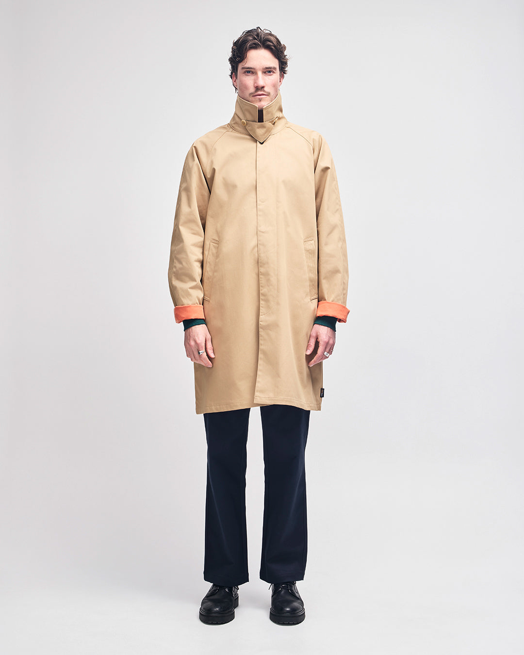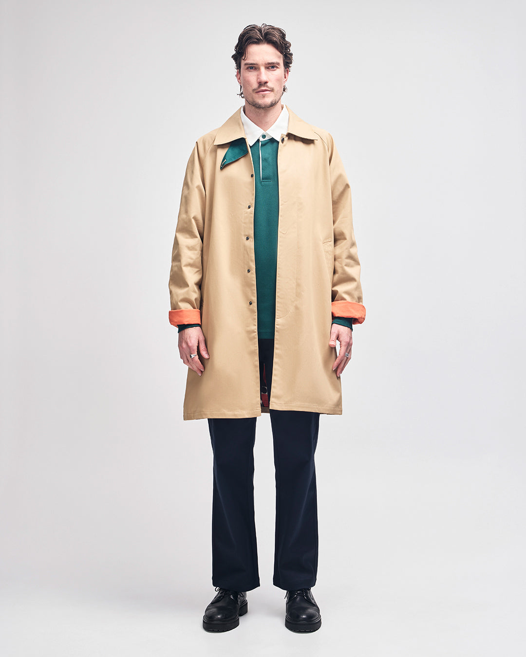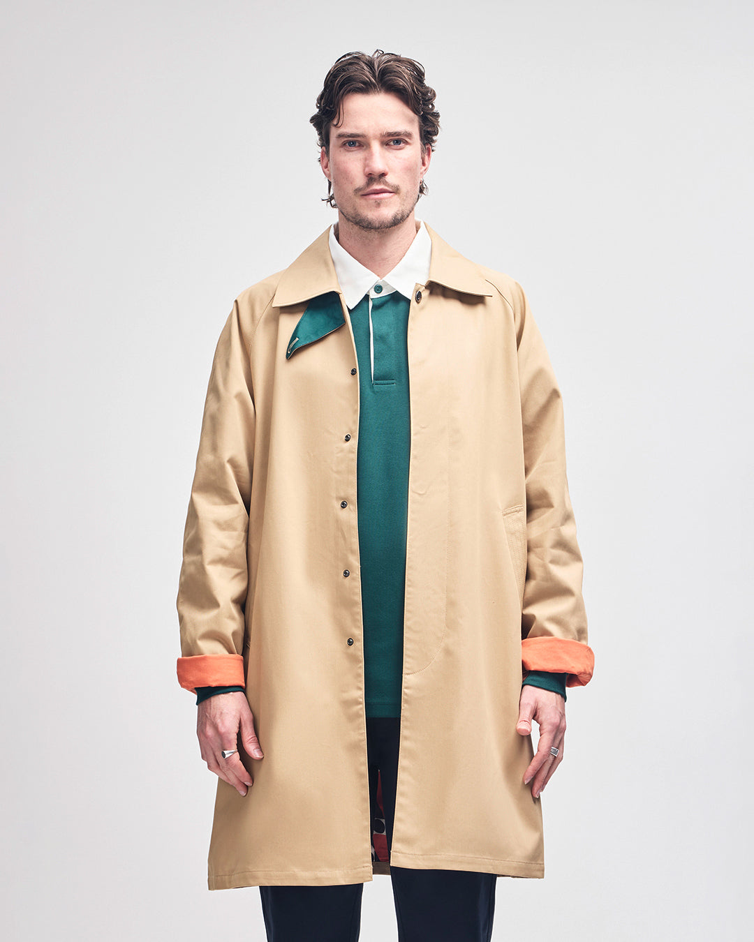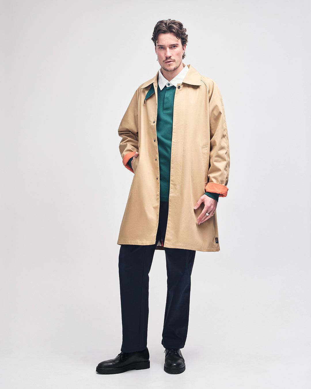 Deus Ex MachinaとMINIは、MINIとDeusのクルマに対する情熱の歴史的な遺産を称えるパートナーシップを結び、レースの伝統と現代的なデザイン感覚を見事に融合させたコラボレーションを実現した。その中心となるのは、Deus Ex Machinaによってカスタマイズされた、多くの人々に愛されているMINI John Cooper Worksである。リラックスフィットのミドル丈レインマック。裏地はヤーデージ柄。フロント中央の前立てにアートスナップ、背中にアートラベル、下部のウェルトポケット、フロント中央の前立ては隠しスナップボタン付き、通気性を確保する二重構造のバックヨークパネル、動きやすさを考慮した背中の下部ベント、コットンとコーデュラの混紡素材で、裏地には防水ジャージーがボンディングされている。